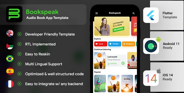 Audio Book Android App + Audio Book iOS App Template – Online Book App – Bookspeak – FLUTTER