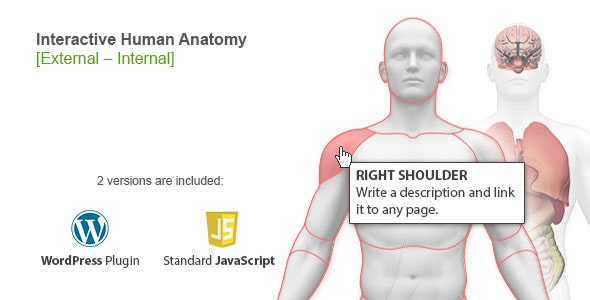 Interactive human anatomy with clickable body parts including head, arms, legs, chest, abdomen, etc. And clickable internal organs including lungs, liver, stomach, etc. It comes in both installable WordPress plugin version and Standard JavaScript version (HTML/JS/CSS) to be installed in websites.