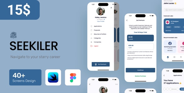 Seekiler is a premium, all-encompassing job finder app UI kit template, meticulously crafted to cater to the evolving demands of job search platforms and users. This state-of-the-art toolkit is designed to streamline the development of a sophisticated, stylish, and feature-packed job search application.